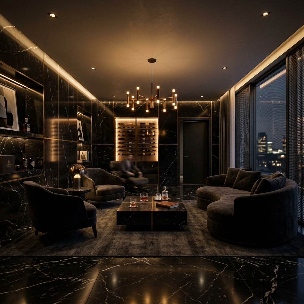 黒大理石の冷徹な美しさと、温かみのある仄暗い照明が織りなす空間。 それは単なる居住空間を超えた、あなたのプライベート・ラウンジ。
